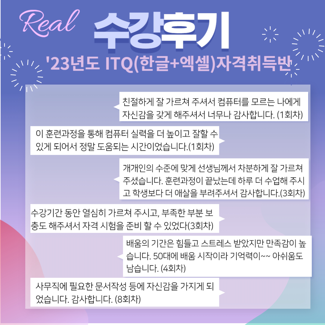 2023년도에 ITQ 수업에 참여하신 분들의 실제 수강후기를 정리해 봤습니다.